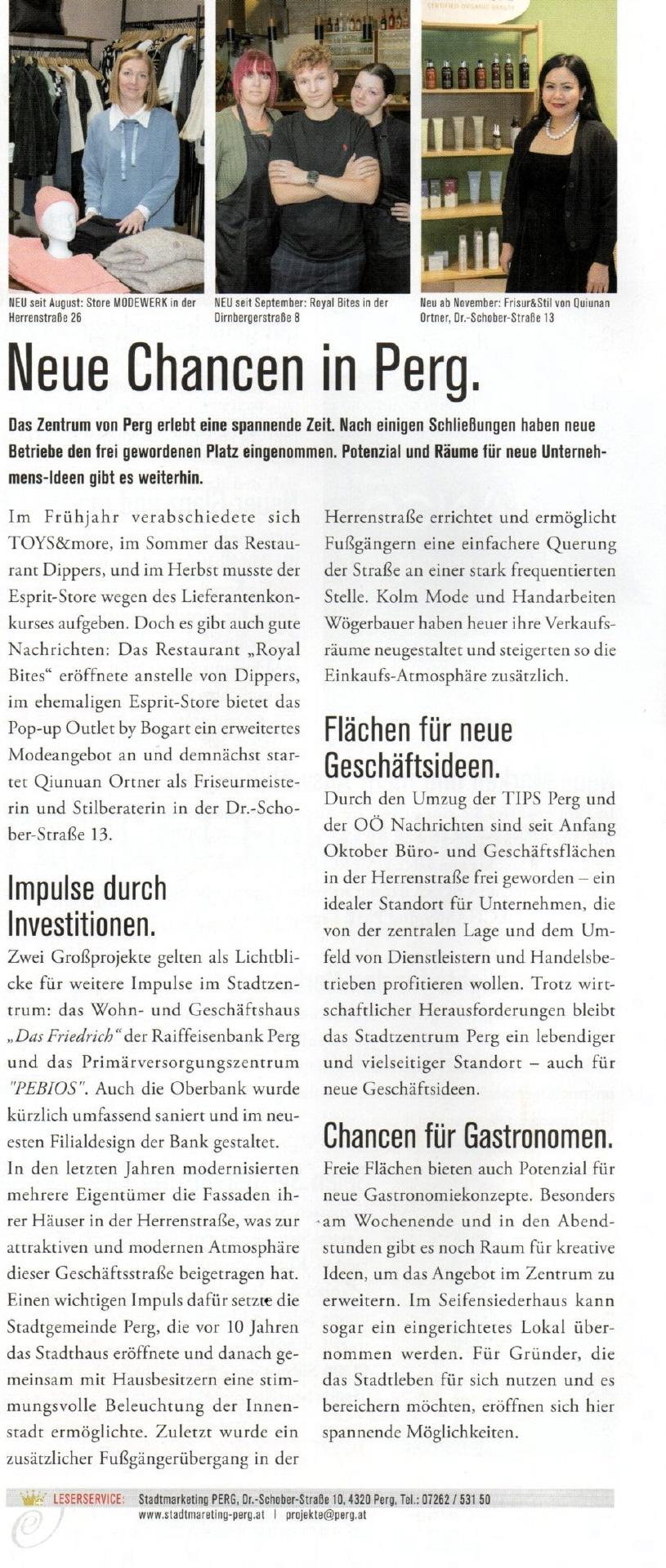 In Perg tut sich was! Auch im November 2024 gibt es wieder spannende Neueröffnungen und frischen Wind in der Innenstadt. Drei engagierte Unternehmerinnen und Unternehmer stellen sich neu auf – mit Herz, Stil und kreativen Konzepten. Wir freuen uns besonders über den Zuwachs in der Dr.-Schober-Straße: Qiunuan Ortner eröffnet ihr neues Studio für Frisur & Stilberatung – natürlich schön, individuell und mit viel Feingefühl.